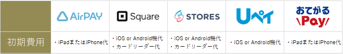 結論、初期導入費用面で見るとエアペイが一番安く、そのあとにUペイ・おてがるPayが横並びです。