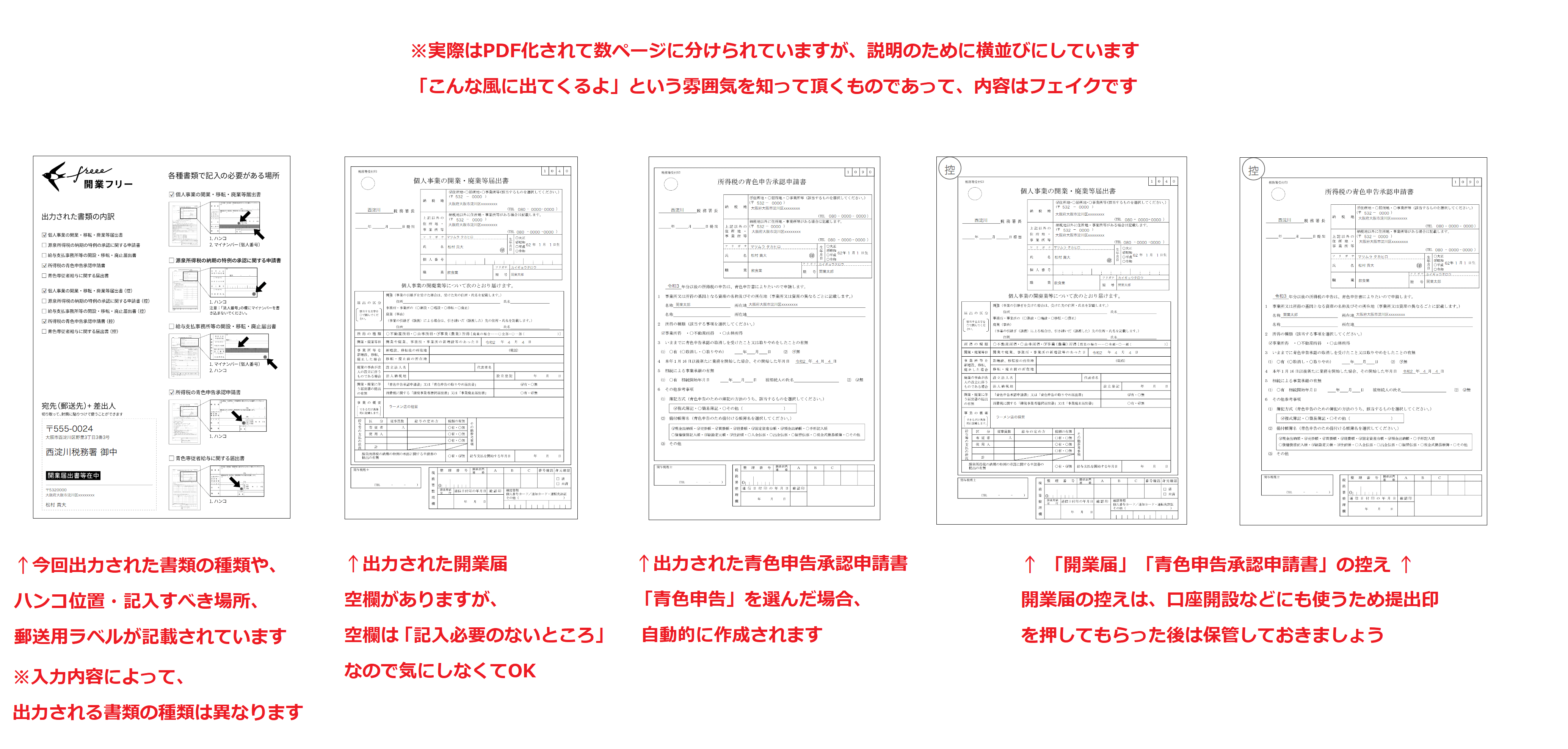 - 答えた内容に応じて開業届以外の「青色申告承認申請書」なども、(自動要否判別された上で)自動的に作成される