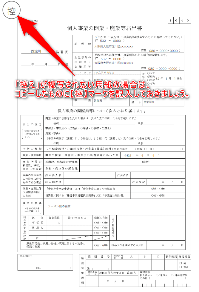 なお開業届の用紙は「1枚ペラのもの」や「複写式のもの」がありますが、1枚ペラの用紙であれば、記入後にコピーを取り、そこに【控】マークを書き入れておきましょう。