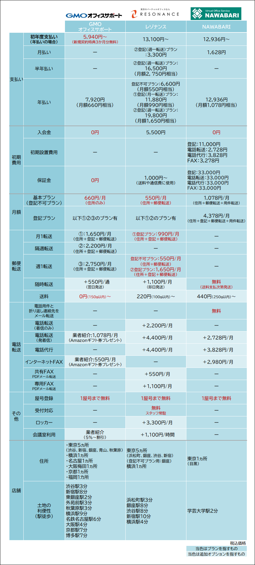 冒頭でも説明の通り、価格重視でバーチャルオフィスを選ぶ際は、基本的には以下の3つを選んでおけばOKです。