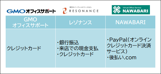 たとえば、格安バーチャルオフィスのおすすめ3選の支払い方法は、それぞれ以下の通りです。