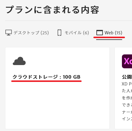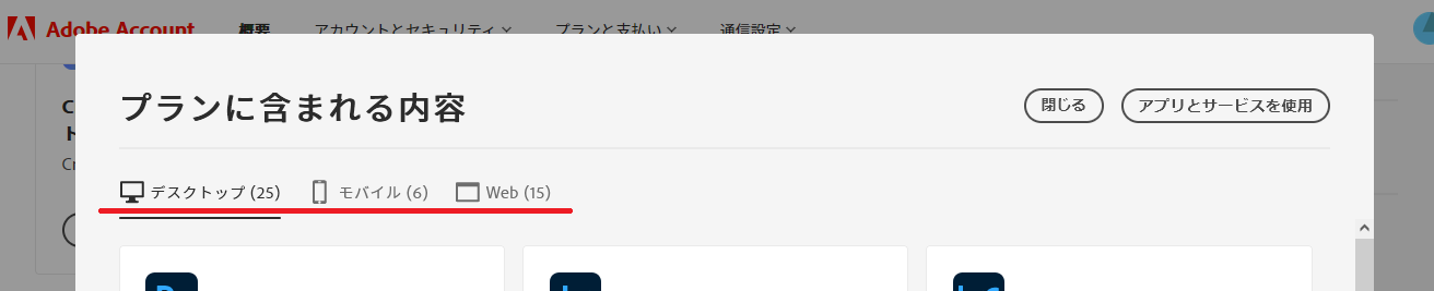 ちなみに、同じくAdobeアカウントのページから「プランに含まれる内容」をクリックすると、以下の通り表示されます。