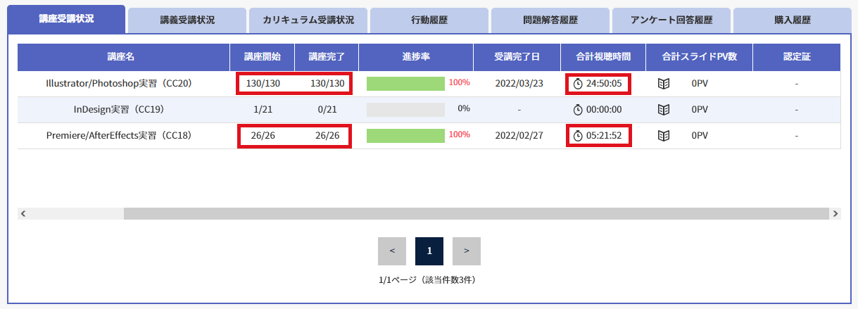 ↑これは私の受講履歴ですが、赤枠の部分を見て頂けると分かる通り、ボリュームがめちゃくちゃ多いです。
