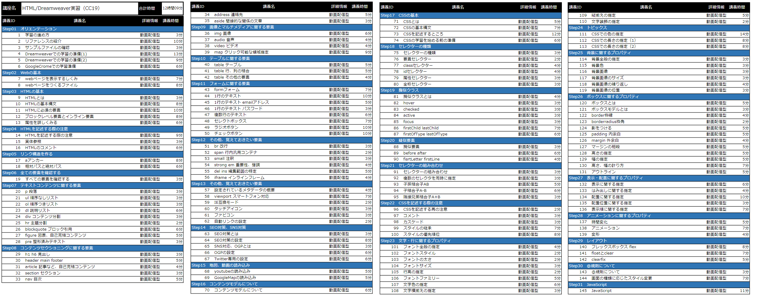 もともとHTMLの知識はある程度持っていますので動画は見ていませんが、これだけの内容があれば、普通のHPだけでなく動きのあるHPもある程度作れますね。